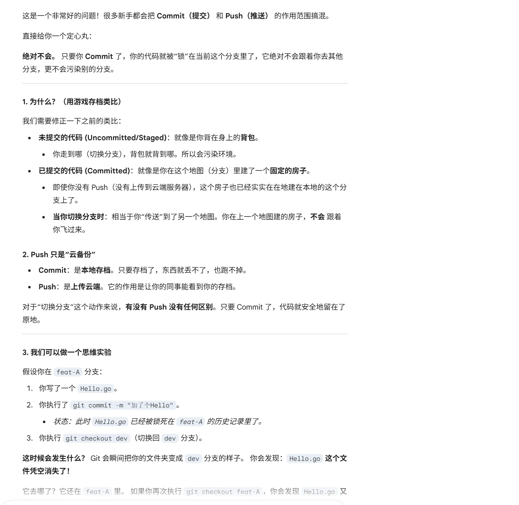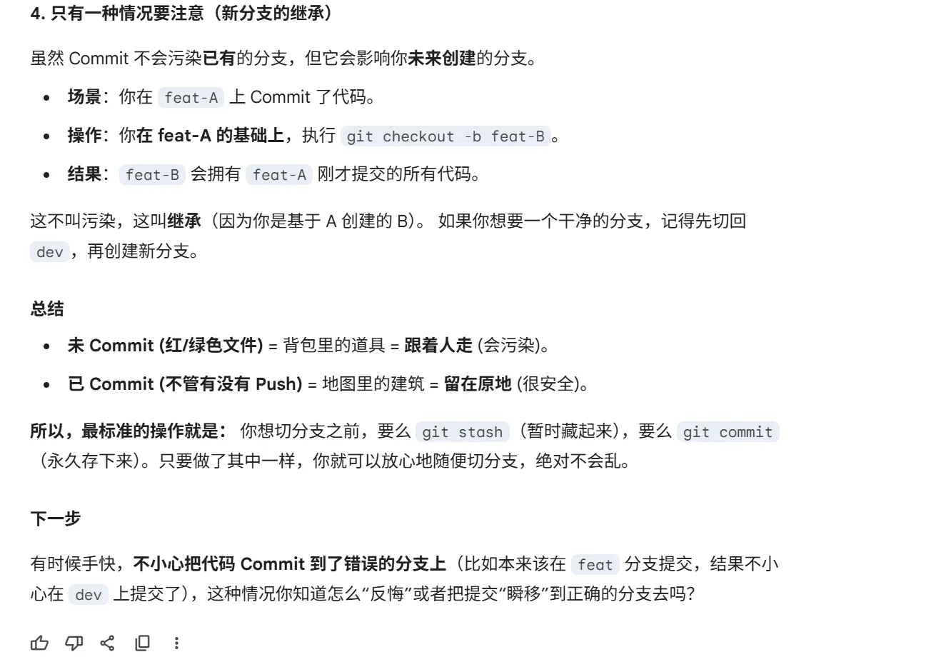 git checkout -b是新建了一个分支,并且继承了原有分支的内容,那我现在是这个情况,我在dev分支开了一个新的分支,然后开始开发,开发一半了,需要去解决原有的功能,这时候我如果checkout再一个新的分支,他会吧我开发一半的东西存下来,但我希望的是原有的分支(也就是不带开发一半的),但开发一半的又不想丢失,怎么办,按理说切换分支,代码不应该不同吗。