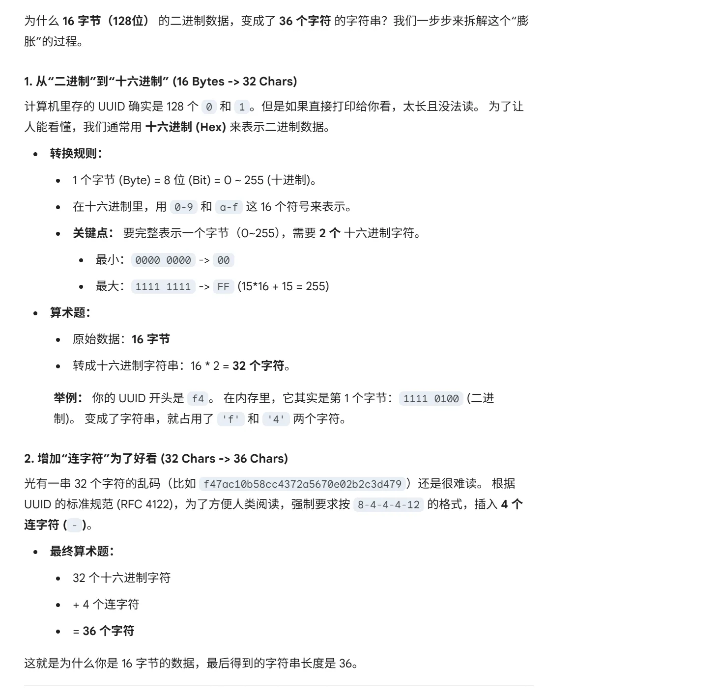 表现长度是36位的16进制。他是固定的128位,然后是16个字节,一个字节是8位可以表示255,那么我们一般用16进制,所以2个字节才能人眼表示一个16进制的,所以是32位了,然后加上4个“-”,所以就是长度是·16位的16进制的字符串。