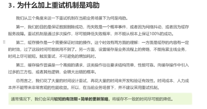 就是更新缓存的时候加上一个重试机制,但是很鸡肋,用不上。 重试机制优化:为了解决重试时间过长堵塞其他进程的执行,所以我们可以使用协程采用异步更新的方式。不过,再怎么优化,这个重试机制就是比较鸡肋的