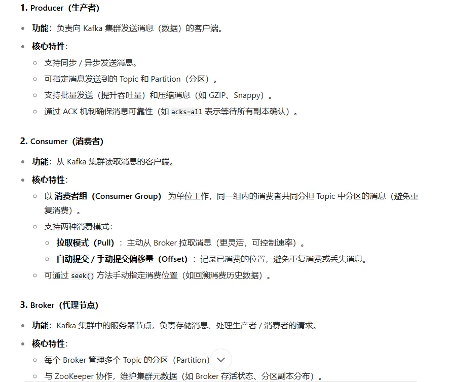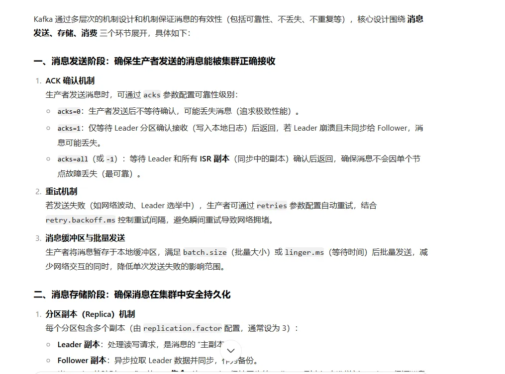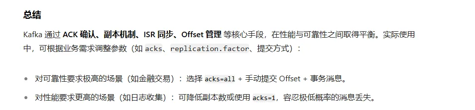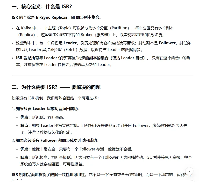 acks=0:生产者不等待任何确认。速度最快,但可能丢数据。acks=1(默认):生产者只需等待 Leader 将消息写入其本地日志即可。这是一个很好的平衡,但如果 Leader 写入后立即宕机且数据未同步到 ISR 中的任何 Follower,数据仍会丢失。acks=all(或acks=-1):这是与 ISR 强相关的设置。生产者需要等待 Leader 将消息成功复制到 ISR 中的所有副本 后才收到确认。这是最安全的方式,可以保证只要 ISR 中至少有一个副本存活,数据就不会丢失。