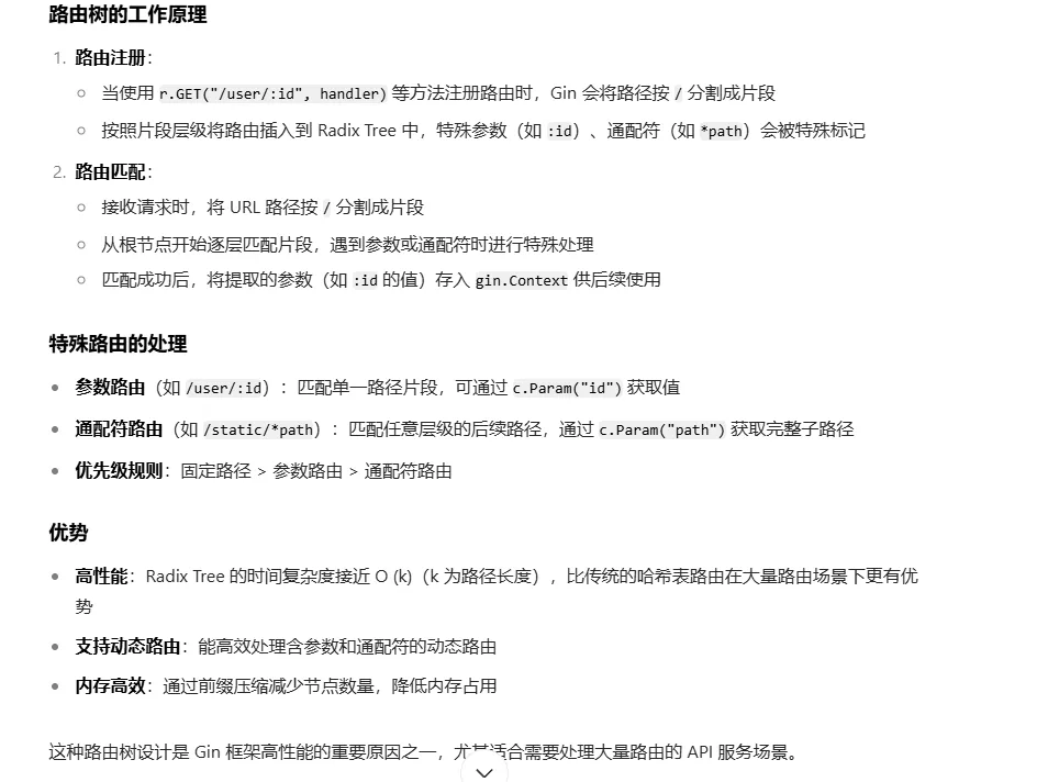 Gin 框架的路由实现基于 Radix Tree(基数树,也称为压缩前缀树),这种数据结构专为高效的字符串前缀匹配设计,非常使得 Gin 的路由路由匹配性能非常出色。