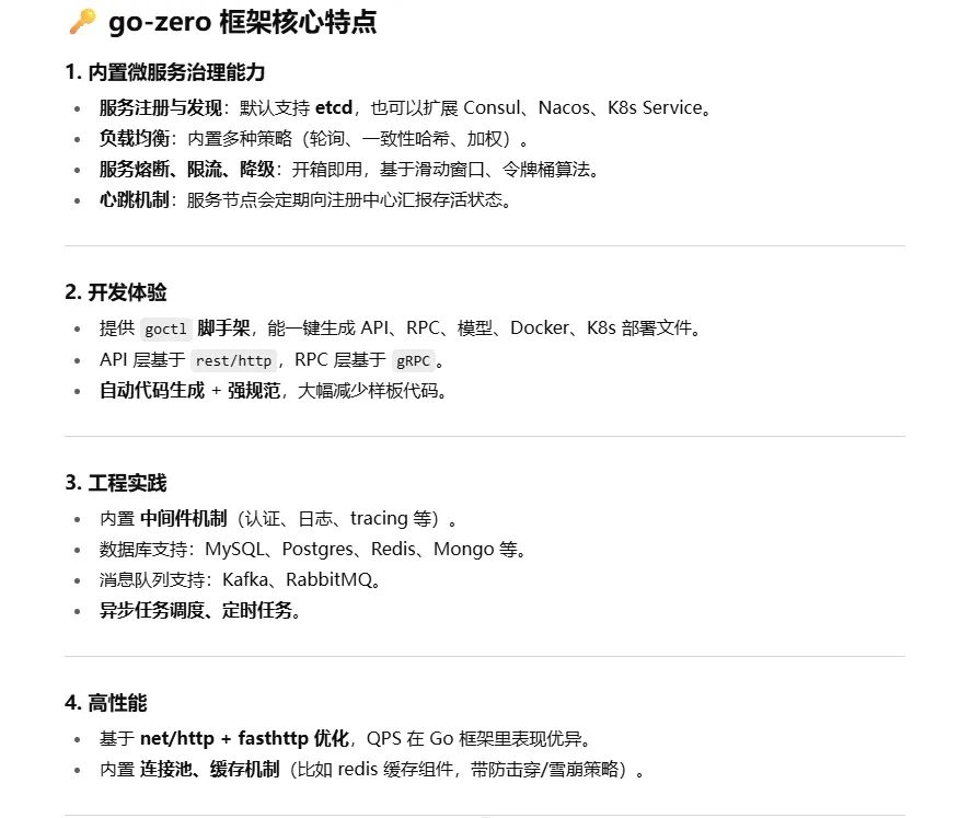 go-zero 是一个国产的微服务框架,定位是“面向工程落地的 Go 微服务框架”,强调 高性能、易用性、工程实践完备。