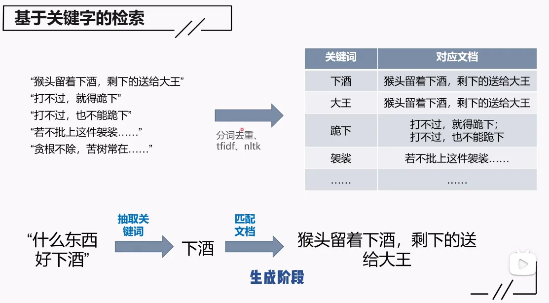 像倒排索引,关键词会对应文档,但是相应的,他不是根据语义,只是根据关键词,所以适用于准确,提问比较详细的阶段,比如我想要中国法律的第几条法律条文